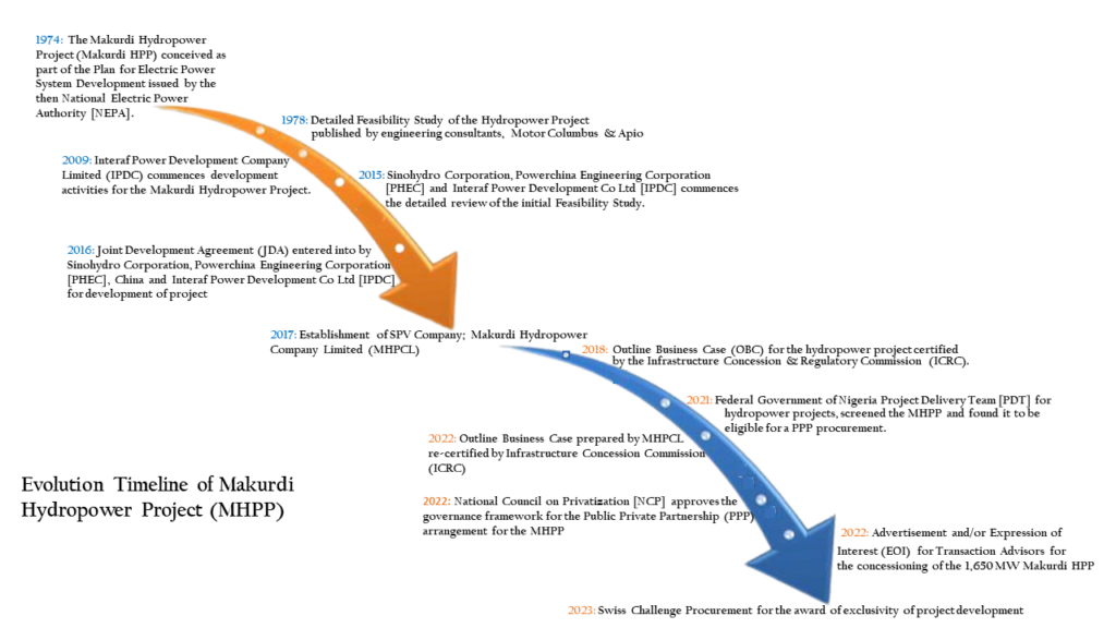 In 2015, Interaf Power Development Co. Ltd, a wholly indigenous energy development company partnered with PowerChina International Group (Sinohydro) to embark on new feasibility studies for the Makurdi Hydropower Dam Project. Makurdi Hydropower Project Co. Ltd [MHPCL] was incorporated in 2017 as a special purpose vehicle (SPV) to bring the Makurdi Hydroelectric Power Project to fruition.